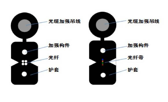 光缆结构是将光纤(或光纤带)放置在两根平行加强件中间,同时在一端平行位置放置一根金属吊线后挤包一层阻燃聚烯烃护套(LSZH);光纤芯数可以为1芯、2芯、4芯。