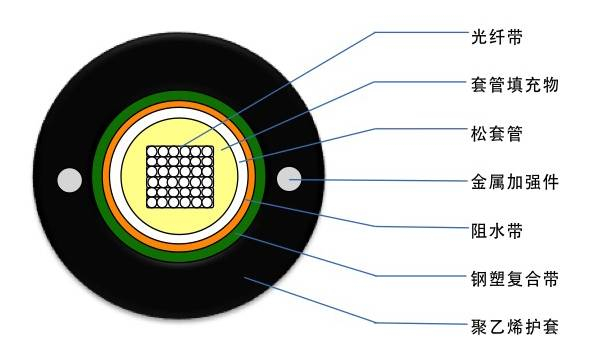 "室外用、非金属加强件、光纤带、油膏填充铝-聚乙烯内护套、钢-聚乙烯外护套"
