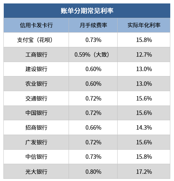 信用卡分期的计算与花呗类似,实际年化利率也在12%以上,小巴整理了一张各大银行的分期月费率与实际年化利率的对比: