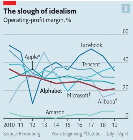 如果拉长时间线,将过去十年四大科技巨头的营业利润率比较来看,谷歌母公司Alphabet低于Facebook和苹果,且一路成下滑趋势。虽然其高于亚马逊,但后者近些年一直呈现上涨的趋势。营业利润率,反映着一家企业的赚钱能力,在这一维度上,谷歌逐渐呈现掉队的趋势。反映在资本市场上,谷歌当前10900亿美金的市值。也已经大幅落后于苹果、微软与亚马逊的21300亿、16700亿与16400亿美金。