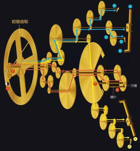 接下来我意识到26.5×2=53。事实上,赖特已经估计到一个关键的齿轮有53个齿,此时我明白,这个齿数让所有问题迎刃而解。设计者按行星齿轮的方式布置槽针和槽,从而在保持基本转动不变的情况下巧妙地延缓了它的变化周期。这真是一个天才的构想。由于埃德蒙兹的努力,我们还意识到装置背面的行星齿轮系统带动着一根轴,而这根轴又带动另一根连接着装置正面表盘的空心轴转动,这样月球的运动就能够在黄道带盘面和月相显示上表示出来。至此,几乎所有齿轮的齿数都弄清了,但还有一个小齿轮的齿数至今仍是一个谜。