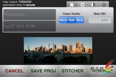 在使用Panoramatic 360拍摄时,可以根据需要设置每张照片的分辨率,根据照片尺寸软件渲染时间也不同,一般情况下一张只用Panoramatic 360拍摄的360度全景照片需要5分钟时间。Panoramatic 360的拼接效果十分不错,拍摄时只要对准,基本看不到拼接的缝隙,照片拼接处过度十分平滑。