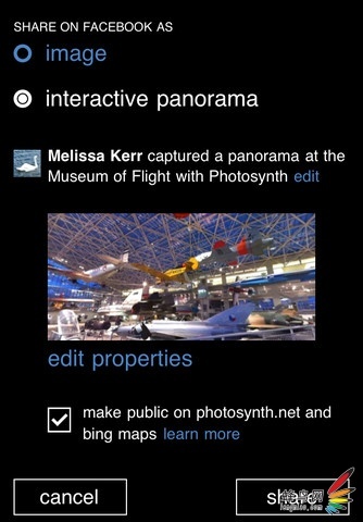 Photosynth支持完整360度全景拍摄,不会留有任何死角,所有景物一览无余。用户可以把通过Photosynth拍摄的照片上传到Photosynth.net服务器上,并为所拍摄的全景照片添加地理信息等;通过社交网站可以将全景照片分享给好友。Photosynth的效果和易用度都非常不错,并且此App为免费版本。