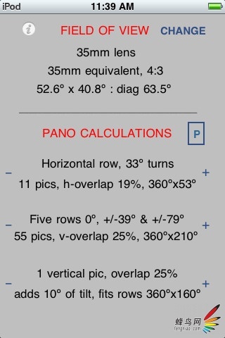 在使用单反相机拍摄全景照片时,角度的计算等非常困难,PanoCalc便可以帮助摄影是快速计算出在使用不同品牌、不同型号的镜头时,拍摄区域和每一张照片所需要的旋转角度数据,通过PanoCalc计算的角度数值,设置相机角度。