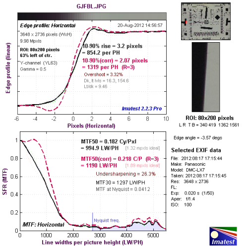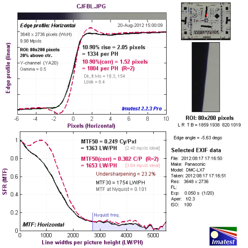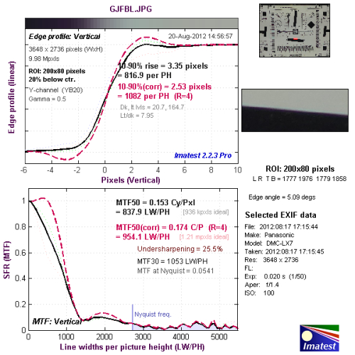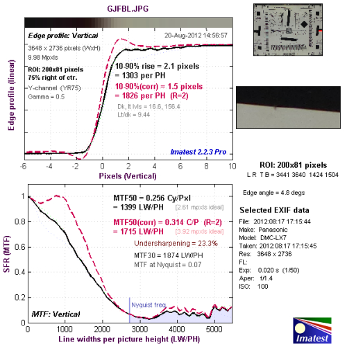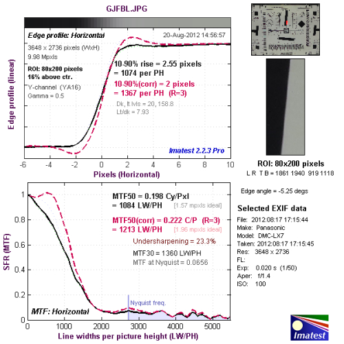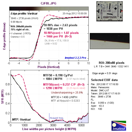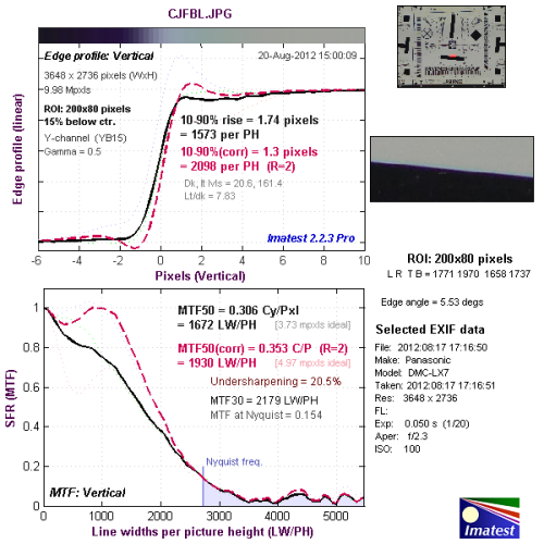 我们使用Imatest对本次评测所使用的松下LUMIX DMC-LX7的分辨率与色散情况进行了测试,大家可以将测试所得的分辨率结果与上图标准进行比对,从而获得直观而明确的参考。