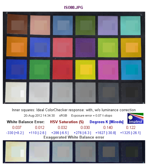 白平衡偏移方面,曝光值误差在0.07,白平衡没有偏移。白平衡方面,色温5500K的光照环境下,ISO 80时的偏移最高处为0.140,色温偏移数值为+1627,白平衡偏冷。