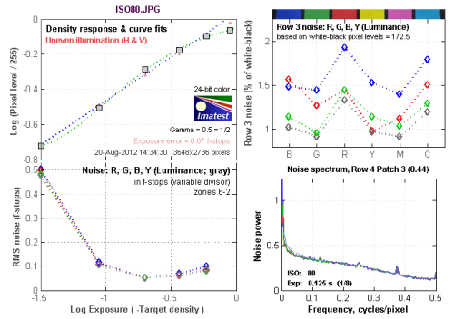ISO 80的最高躁点值为0.51左右,属正常情况。从Row 3 noise:R,G,B,Y (Luminance)图表中可以看到,在蓝色上是以红色通道的噪点为最多,达到1.56左右。 红色上是以蓝色通道的噪点为最多,达到1.97左右。绿色通道的噪点最高值出现在蓝色上,达到1.49左右。