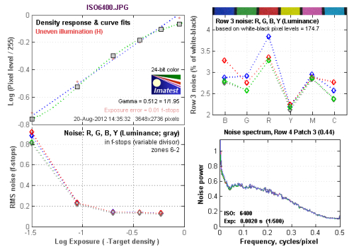 ISO 6400的最高躁点值为0.93左右,噪点尚可。从Row 3 noise:R,G,B,Y (Luminance)图表中可以看到,在蓝色上是以红色通道的噪点为最多,达到3.37左右。 红色上是以蓝色通道的噪点为最多,达到3.8左右。绿色通道的噪点最高值出现在蓝色上,达到2.98左右。