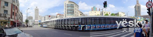 全景模式已经不再新鲜了,所以这次我们要介绍的不是何谓全景,而是分享一些收获,众所周知在拍摄全景照片时,如果出现运动特别是高速运动的物体 会对画面造成一定的破坏,而正是基于这一特性,使我们获得了一张难得的奇作,在我们按下快门时正好一辆巴士启动了,所谓箭在弦上不得不发,停下的结果必然 是拍摄失败,所以就干脆与巴士一起匀速运动,而结果却令我们欣喜,在全景照片中,单体巴士成为了一条长龙。