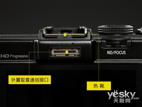 如果LX7的内置闪光灯还无法满足用户的需要,可以通过顶部的热靴安装选配的外置闪光灯,热靴下方的接口用于与外接的取景器进行信息通讯,可以满足有更高要求的客户需要。