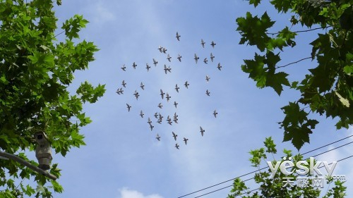 拍摄好大部分日光样张之后我们开始回程,看到一群鸽子正被放飞,遂开启运动模式,进行抓拍,虽然鸽子的飞行速度较快,但凭借开启运动模式后所提高的反应速度,可以明显看到鸽子在画面中成像紧实,边缘清晰,说明这款滤镜确实有效。