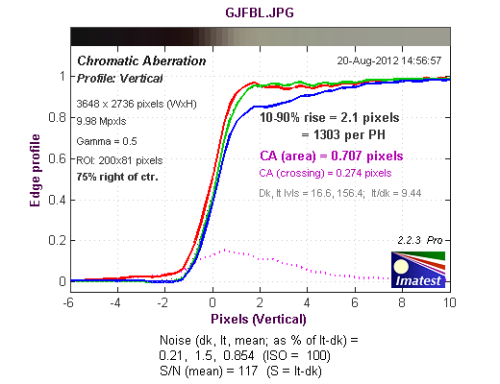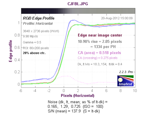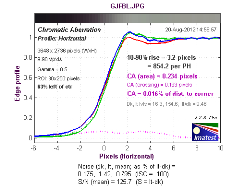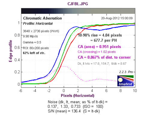 从长焦端中心水平方向色散测试结果来看,色散区域为0.518像素,蓝色通道的色散略高于其他通道。