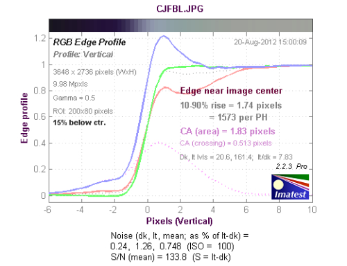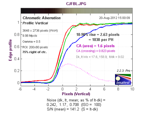 从长焦端中心垂直方向色散测试结果来看,色散区域为1.83像素,蓝色通道的色散高于其他通道。