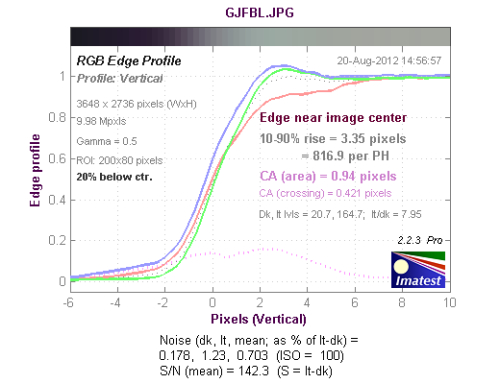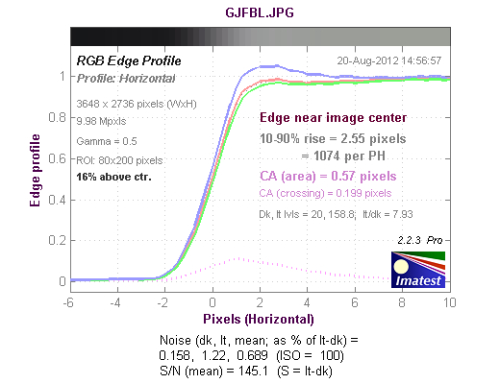 从边缘水平分辨率测试的结果看,分辨率达到了1190LW/PH,属于好的水平,机内进行了一定的锐化,出现了驼峰现象。