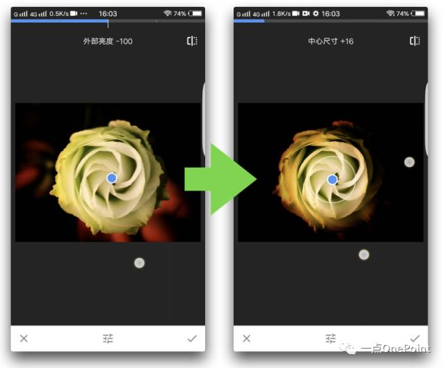 然后左右滑动手指,你就能改变中心以外区域的亮度。