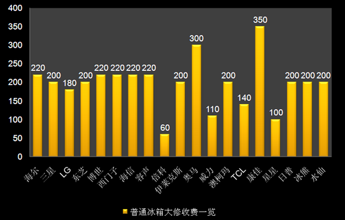 普通冰箱的中修和小修就是进行部件的调试和换件,中修的费用相差较大,康佳、奥马,澳柯玛在200元左右,而博世、西门子等仅为60元。小修的费用一般在100元以下,而东芝冰箱的小修费用最高达到120元,其余的收费水平保持在80以下。