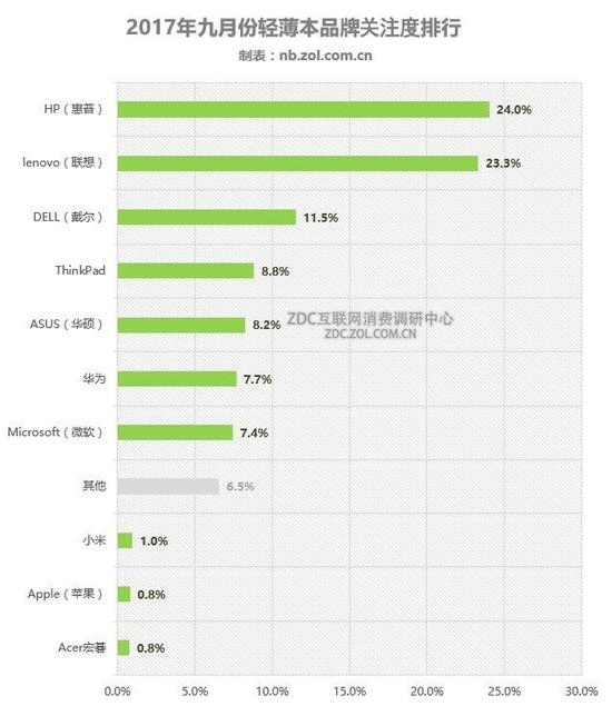 根据ZDC互联网消费调研中心数据显示,2017第三季度,笔记本电脑品牌整体关注依然延续前两个季度的关注分布,不过在细节上则有相对比较明显的变化。