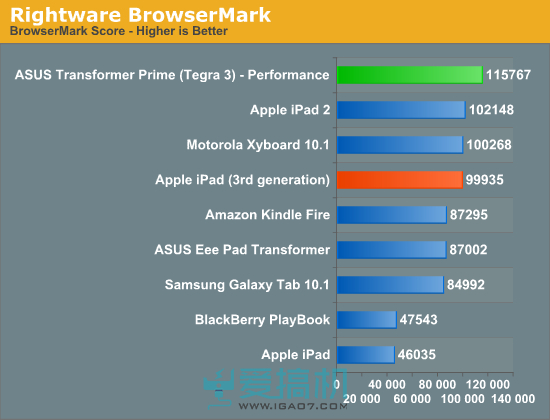 GPU 性能方面,SGX543MP4在当时也表现出了很霸道的绝对性能,在Offscreen测试中可谓一骑绝尘,但是由于分辨率过高, 在亮屏成绩上甚至还不如iPad 2。在实际体验中也的确如此,The New iPad在流畅性方面的确比较差,或许是这个原因,它也很快地被iPad with Retina Display取代了。