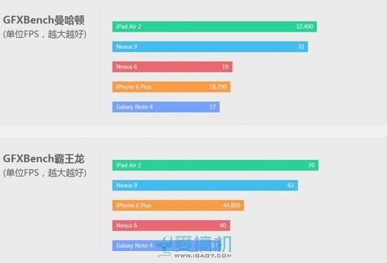 GPU方面,iPad Air 2表现很强势,但是并没有达到统治级的地步,跟Nexus 9相比也只是略胜,当然要和手机比的话啊,iPad Air 2依然有着巨大的优势。