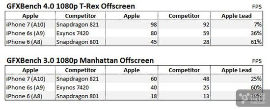 苹果已经从A8开始基于Imagination Technologies的IP定制GPU,在GPU上依然没能发挥巨大的优势。可能很多人认为iPhone屏幕分辨率比竞争对手低,性能才得以发挥出来。不过,在offscreen原始性能方面,下面的图表还是能够看到苹果领先对手的性能差距: