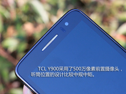 TCL Y900采用了一块5英寸的720P屏幕,采用IPS显示技术,屏幕PPI为294,肉眼看上去已经较为细腻了(非常接近300ppi的视网膜屏了)。黑色触控面板的屏幕在关闭状态下与机身边框基本上融为一体,不会很突兀。