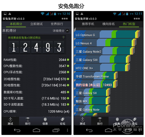 上面是各种软件的跑分,可以看到和目前市面上的主流四核机器还是有一定差距的。但是很明显的,MT6589的性能已经比起MT6577提升了不少,超过了性能过剩的水平了。另外就是MT6589四核比起主流的四核处理器功耗控制要更好一些,这也是其优势所在。