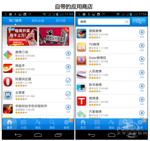 手机自带有应用商店,不过检索机制上TCL Y900还有些小问题的,搜索全称“新浪微博”才会出现微博,而搜“微博”则显示上方的结果。