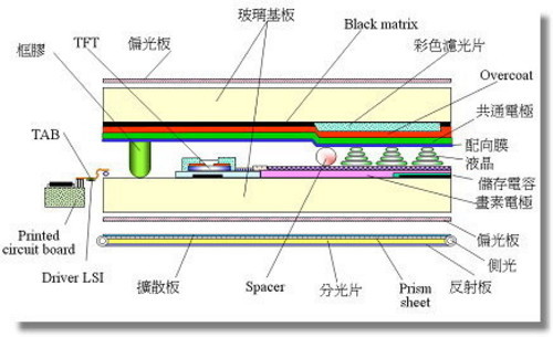 TFT其实是AMLCD(有源矩阵液晶显示器)的一种。其材料本身并不发光,因此需外加背光源。简单地说,TFT面板的基本结构是两片玻璃基板 中间夹一层液晶,前端LCD面板贴上彩色滤光片,后端TFT面板上制作薄膜晶体管。当在晶体管上施加电压时,液晶发生转向,光线穿过液晶后在前端面板上投 射一个像素。背光模块位于液晶层面板之后负责提供光源。彩色滤光片给每个像素一个特定的颜色,结合每一个不同颜色的像素呈现出来的就是面板前端的图像。