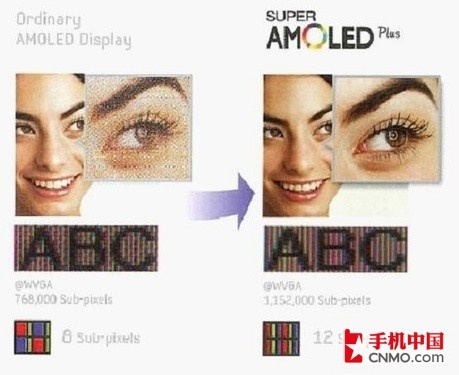 AMOLED 和Super AMOLED虽然表现都已经很出色,但是由于以上两者均采用了PenTile Matrix排列方式,画面看起来颗粒感比较重,仔细看的话,文字边缘会有轻微的毛边,细节表现不够完美。而Super AMOLED Plus的出现有效的解决了这个问题。Super AMOLED Plus改变了Super AMOLED的排列方式为普通的RGB矩阵排布方式,并且加入了DNIe+图像处理引擎,使每个像素点的亚像素数较以往提升了50%,所以影像会更清晰细 致,并且色彩饱和度、细腻度、对比度等等都有了一定的提升。