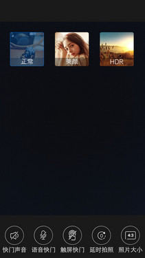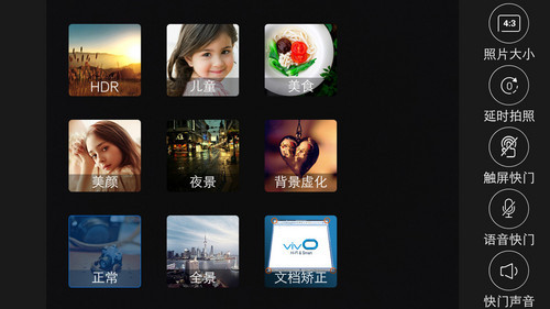 轻点相机界面左上角的三个小圆点,即可看到拍照模式,此模式共有九种,包括全景、美颜、夜景、背景虚化等,而在左侧我们还可以看到照片/视频大小、趣味摄像、触屏快照、延时快门等实用功能。