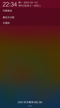 在下拉菜单中,我们不但可以看到阳历时间表,而且连农历也一并显示,如果你设置了流量监控,在界面下方还可看到本月剩余流量,非常贴心。此外, 要是用户开启太多应用程序,用手指从屏幕下方向上滑动便可调出后台管理以及常用功能快捷键界面,在此界面中,只要用户按住开启的应用程序向上滑动即可结束 应用程序。