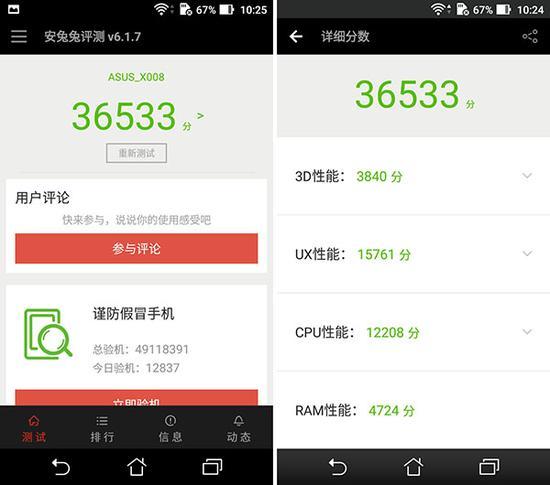 跑分上,华硕飞马3的安兔兔评测成绩不到4万分(测试中使用的是2GB RAM+16GB ROM的标准版飞马3),这个分钟比较真实的反应了飞马3的性能,对于普通的日常使用来说毫无压力,大部分的游戏也没有问题。