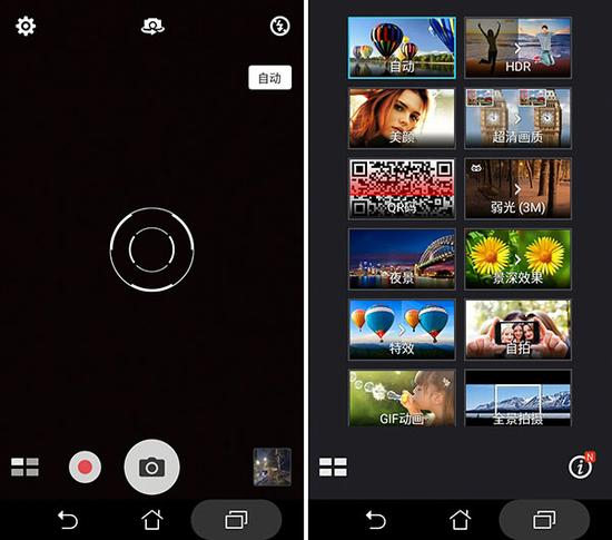 拍照软件上,飞马3继承了华硕简单上手的界面,各种设置不需要我们太过寻找,并且在拍照界面中,会清楚的标明,我们现在处在什么拍照模式之下,非常直观, 且易于切换。不过华硕飞马3在拍照时,自动对焦的敏感程度相当高,我们稍稍移动一下手机,便会重新自动进行对焦,面对经常出现的圆形对焦动画,初时使用非 常让人不悦。