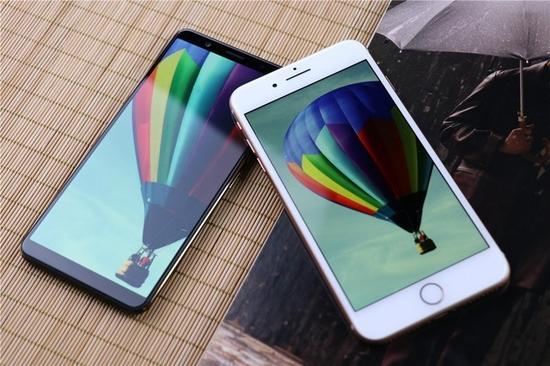 屏幕比例方面,vivo X20是18:9,iPhone 8 Plus是16:9。两块屏幕的宽度是相同的,也就是说,vivo X20的6.01英寸比iPhone 8 Plus的5.5英寸就多在竖向增加的240排像素上,两块屏幕的像素密度是相同的,实际观感上两块屏幕的精度差别不大。