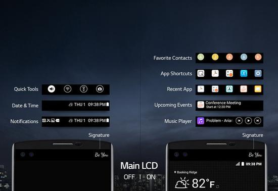熄屏状态下显示信息的功能正被许多智能机所采用。但是无一例外的是,这些手机均采用了OLED屏幕。然而LG不走寻常路,在LG V10上添加了一个辅屏(液晶屏)。