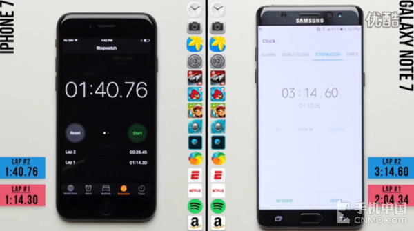 实测结果显示,iPhone 7打开一遍应用耗时1分14秒,打开两遍应用总共用时1分40秒,而三星Note7完成一遍用时2分04秒,完成两遍用时3分14秒。