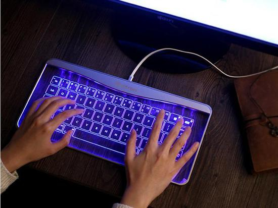 这是Bastron设计的一款超薄的透明钢化玻璃触摸的智能键盘,它科技感非常足,但设计上也非常简单大方。当夜晚时候的时候可以散发出灯光,而在白天的时候,则就是透明状。