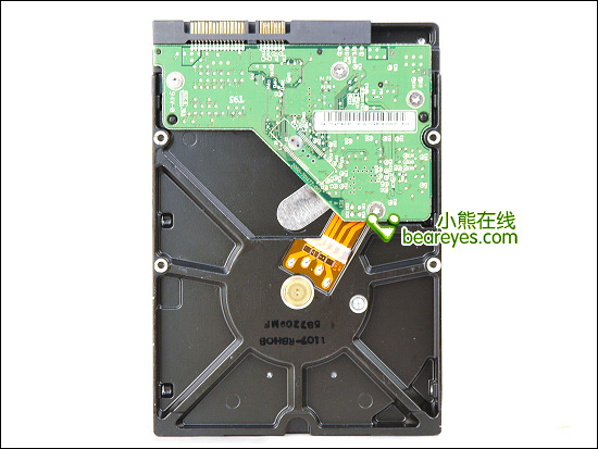 非常苗条的PCB,和以前的JS编号有些相似。背面的散热筋比WD5000ABYS厚,比WD3200YS薄,虽然散热筋的厚度有时能推测盘片数量,但是毕竟过于草率了,而且在这肯定不成立了,因为3200YS是三碟装,3201ABYS怎么也不可能是四碟的。
