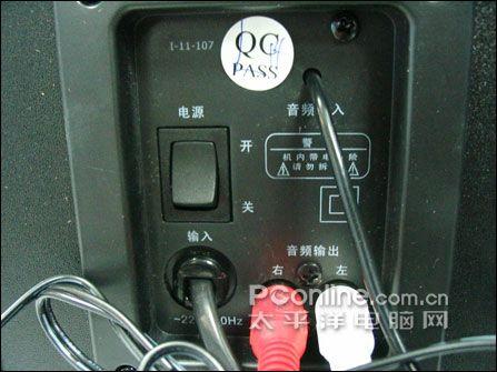 音箱的倒相孔、电源开关、音量、重低音调节旋钮以及输入输出接口都设计在低音炮侧面,要是低音炮放置于桌面下方,调节音量时颇为费事,如果附带一款线控就比较完美了,但作为百元以内低价产品,估计成本并不允许。