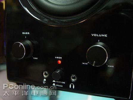 在低音管的外套圈上有一个蓝色的LED指示灯,让用户可以清楚的看到他处于什么状态。卫星音箱外形设计时尚,但是防尘罩并不能取下,该款产品附带VOL线控,可以让用户非常方便的控制音量大小。
