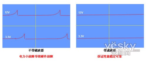 为了保证显卡供电电流更为平稳,富士康显卡对显卡供电进行了良好的滤波。平缓的电流更利于显卡超频,同时减少了瞬时脉冲电流带来的硬件故障。