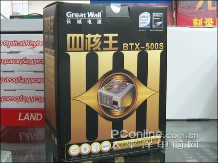 长城 四核王BTX-500S采用黑色外包装,包装中间有一个金色的罗马数字“4”,以表示其四核的王者地位。