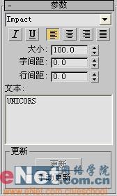 2、展开“参数”卷展栏,修改大小、字型、文字信息等参数,如图1所示。在前面视图区中单击鼠标左键,加入文字text01,如图2所示。