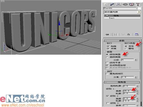 3、选中文字text01,单击“修改”命令面板,在修改器列表中选择“倒角”项并进入其属性面板,在参数卷展栏中勾选“封口”栏下各项,确定封口类型等参数,修改倒角值栏下的级别1、级别2的高度与轮廓值等参数,最终形成的效果如图3所示。