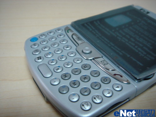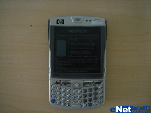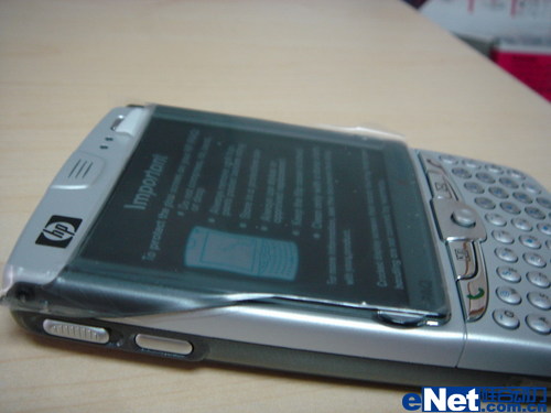 可拆卸式屏幕保护盖是一个十分贴心设计,与高强硬度金属外壳一起为HP iPAQ 6510带来更好的保护,户外随身携带也不用时时担心脆弱的液晶屏受到伤害。另外保护盖的使用也使得屏幕显示看起来更加柔和舒适,即使长时间使用眼睛也不会有酸胀的感觉,这点确实值得其它厂商好好学习。揭开保护盖,可以看到HP iPAQ 6510屏幕的真面目,由于搭载了全尺寸的QWERTY键盘,HP iPAQ 6510的屏幕物理尺寸只有3.0英寸(75毫米),方形的屏幕在阅读和视频应用上比起采用常规屏幕的机种来说毫无优势,这也是为了维持机身长度不至于过长所带来的必然后果。