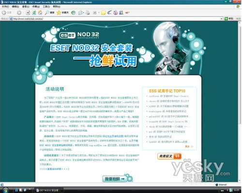 活动主办方二版科技专门开设了主题页面(http://www.nod32club.com/ess/)。在本次活动中,ESET NOD32官方论坛会员凭借会员账号及密码填写试用申请表后,系统会自动发出一个ESET NOD32安全套装产品序列号。之后,会员下载ESET NOD32 安全套装抢鲜试用版,使用序列号到reg.nod32cn.com进行注册,在得到系统回复的用户名和密码后,即可以开始试用。