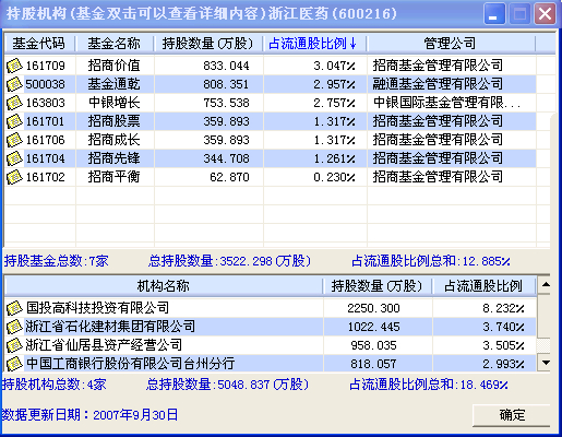 在持股机构中,你可以查看持有该股的基金和机构的名称、持股数量、占流通股比例等信息。在基金名称上双击还可以查看该基金的走势。