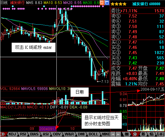 您可以用“同花顺2008”方便地查看历史上的分时走势。只要在K线图上的某根K线上双击鼠标或者将光标移到某根K线上按“enter”键,右下角的分时走势窗口就会显示相应的那一天的分时走势。在分时走势窗口双击鼠标,还可以将该窗口发大,便于您详细查看。在放大之后的分时走势窗口双击鼠标,则恢复成原来的样子。