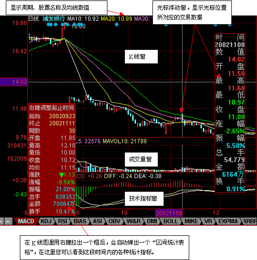 当您看K线图的时候您往往希望知道在某个区域的涨跌幅多大、换手率多少等。在“同花顺”里我们提供了“区间统计”功能,您只用简单地在K线图上您感兴趣的区域用鼠标右键拉出一个框,系统将对这个框所对应时间段里股票的涨跌幅、总成交量、换手率等指标做出统计,让您简单、快捷地分析股票的走势。如上图所示。