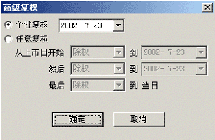 “个性复权”在这里您只用输入一个时间,我们将以这一天的价格为基准对前后历次除权做复权。如右图:
